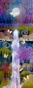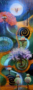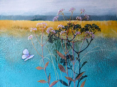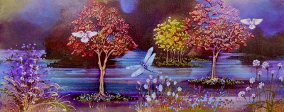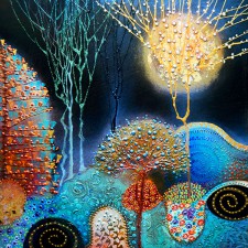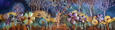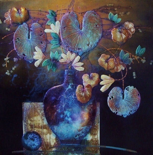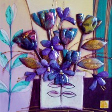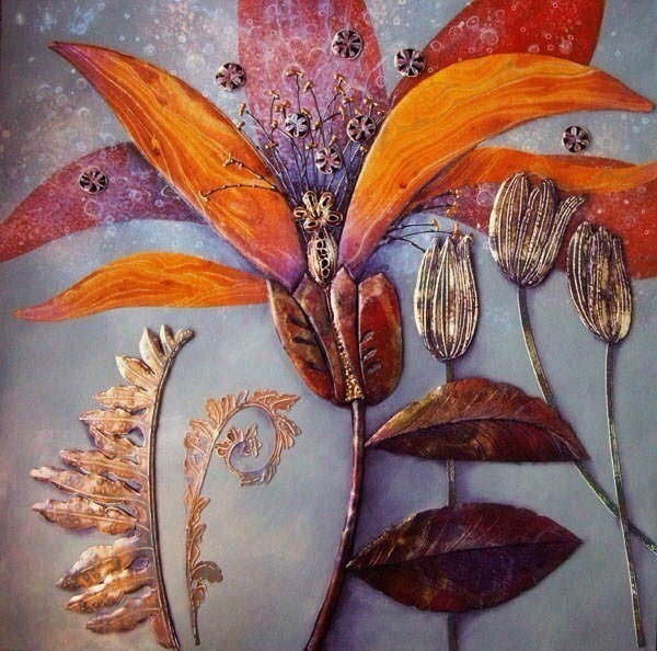 Her paintings are distinctive for their unique sculpture qualities and additional foil technique, a combination of stronge acrylic colour themes, layers and textures using hand finished foils and paper and her unique 3D technique which she developed some 20 years ago . Her subject matter varies from still imagery to landscape, figurative and abstract work.